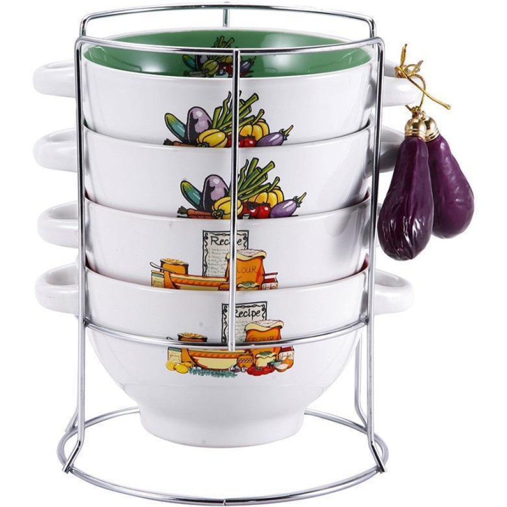 Об'єм мисок: 680 мл. Розміри: Ø14 см * 8,3 см. Колір: білий з декором. Склад набору: 4 миски та 1 металева підставка.