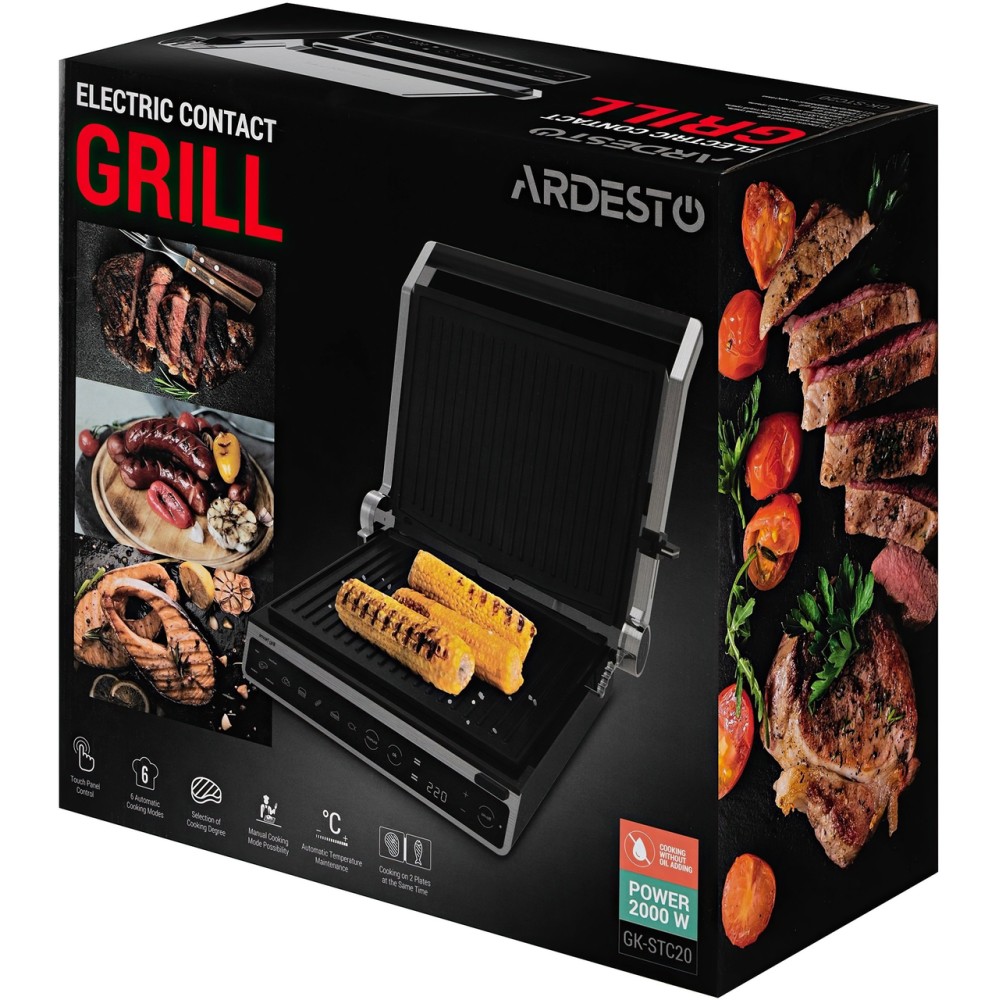 Електрогриль Ardesto з потужністю 2000 Вт підтримує повну регуляцію температури, завдяки чому можна з легкістю контролювати ступінь прожарювання. Таймер розрахований до 30 хвилин, а для індикації роботи та нагріву передбачені LED-індикатори.