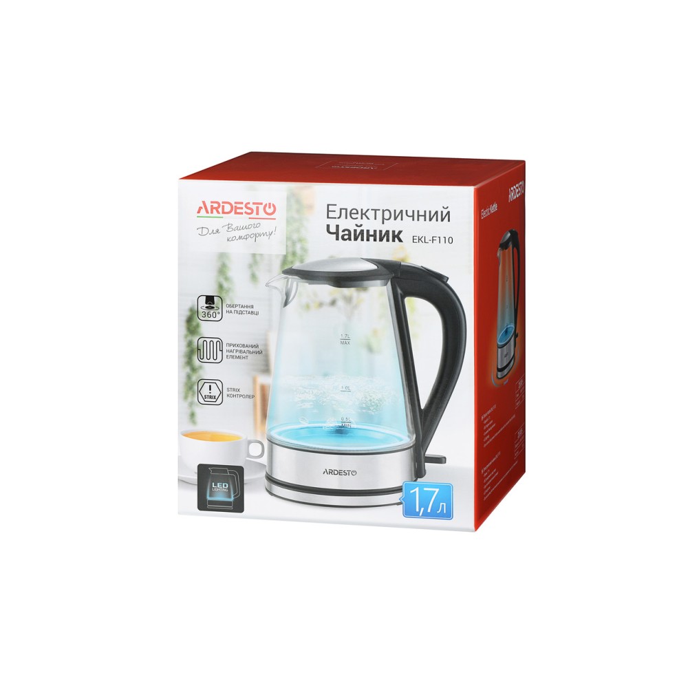 Електричний чайник 1.7 літра скляний з LED-підсвіткою Ardesto EKL-F110 (2150 Вт)