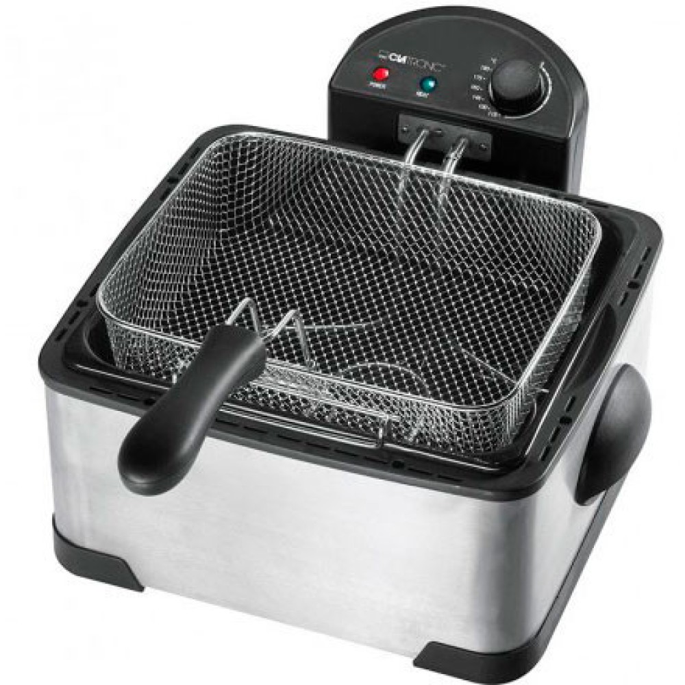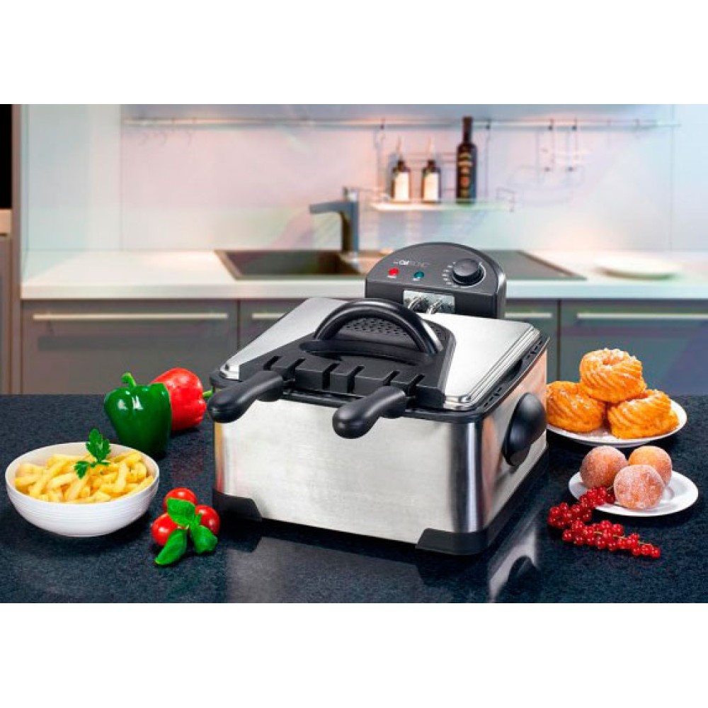Професійна фритюрниця Clatronic FR 3195 має 2 окремі кошики для смаження та 1 велику кошик для змішаних продуктів. Вона розрахована на великі обсяги однакових або різних продуктів з подібною температурою приготування у фритюрі.
