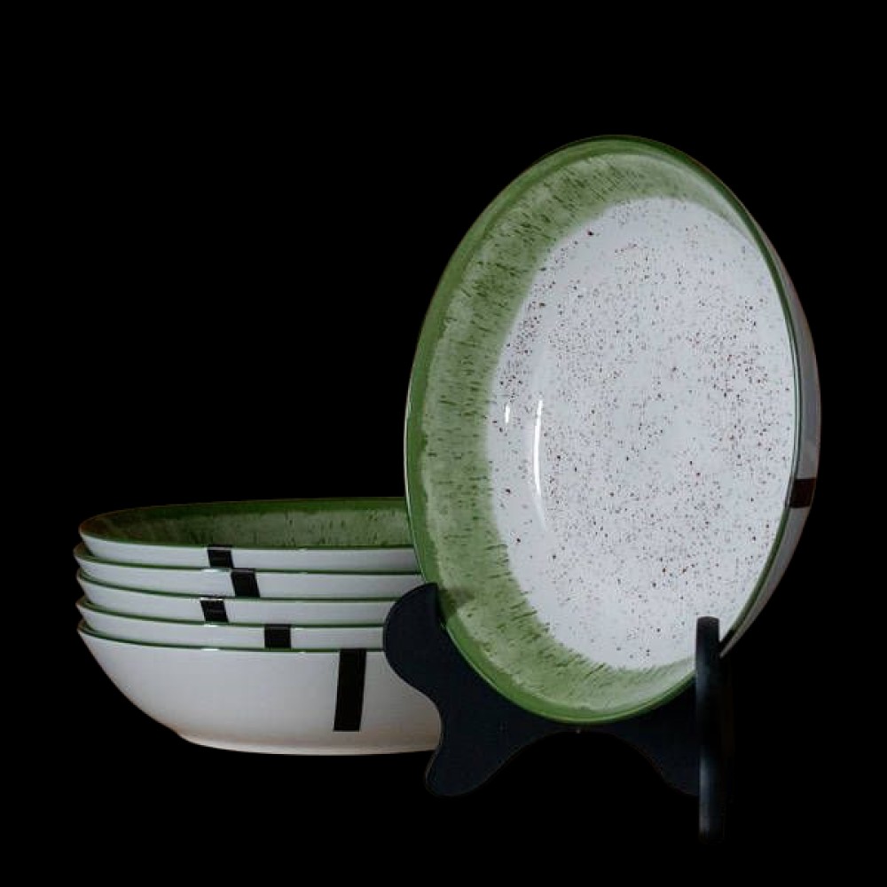Набір повністю виготовлений з надміцної кам’яної кераміки, яка є 100% екологічно чистим матеріалом. Квадратні та круглі тарілки стильно поєднуються, мають гладку поверхню і не вбирають сторонніх запахів і кольорів.