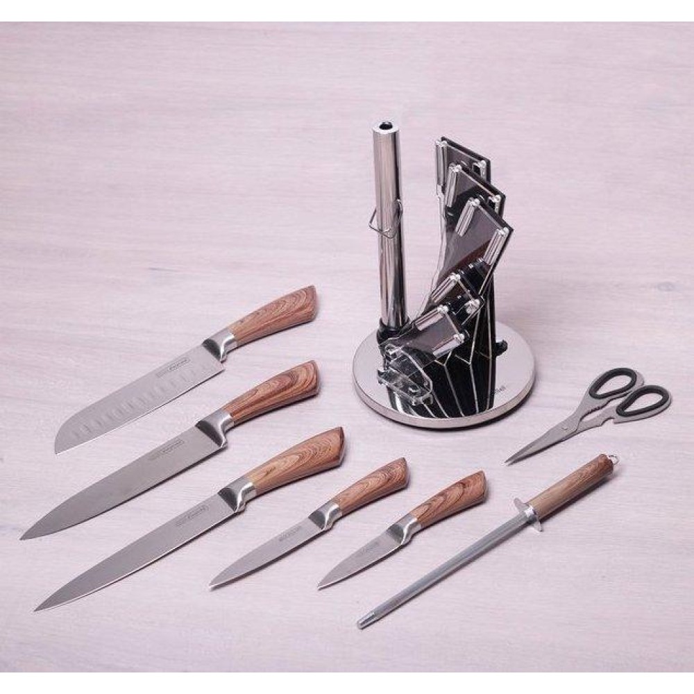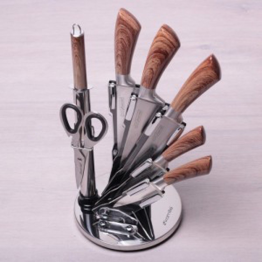 Ножи изготовлены из высококачественной стали, а оригинальная подставка придаст интерьеру вашей кухни незабываемый колорит, подчеркивающий хороший вкус.