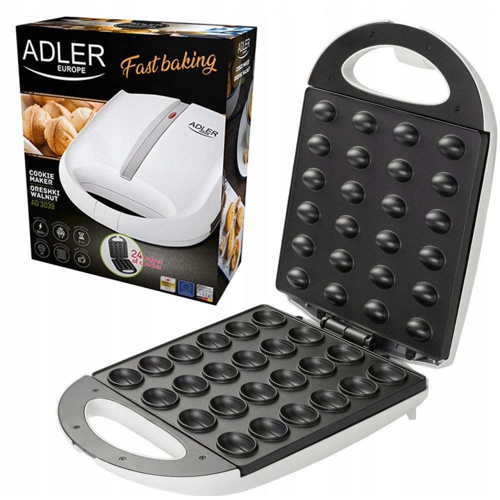 Орешница Adler AD 3039 XL - аппарат для выпечки печенья в виде половинок орехов для наполнения начинкой. Размер XL позволяет выпекать до 24 половин орешков за один цикл.