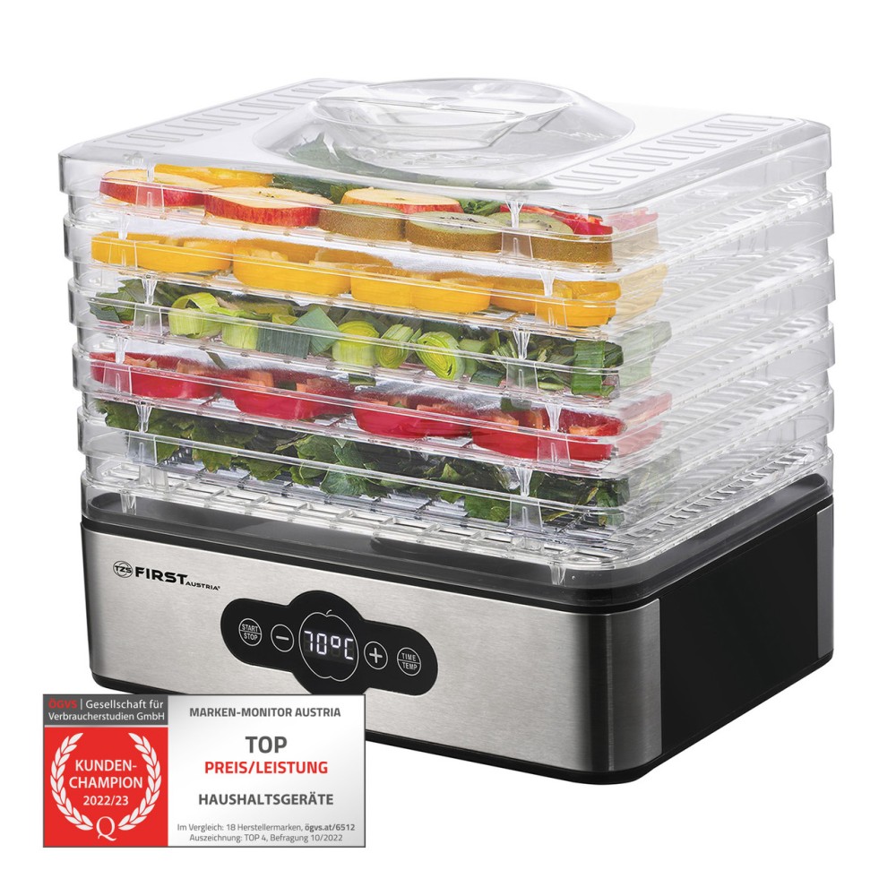 Сушилка для фруктов First FA-5126-5 предназначена для сушки фруктов и овощей с 5 секциями. Она оснащена большой емкостью и идеально подходит для использования в домашних условиях.