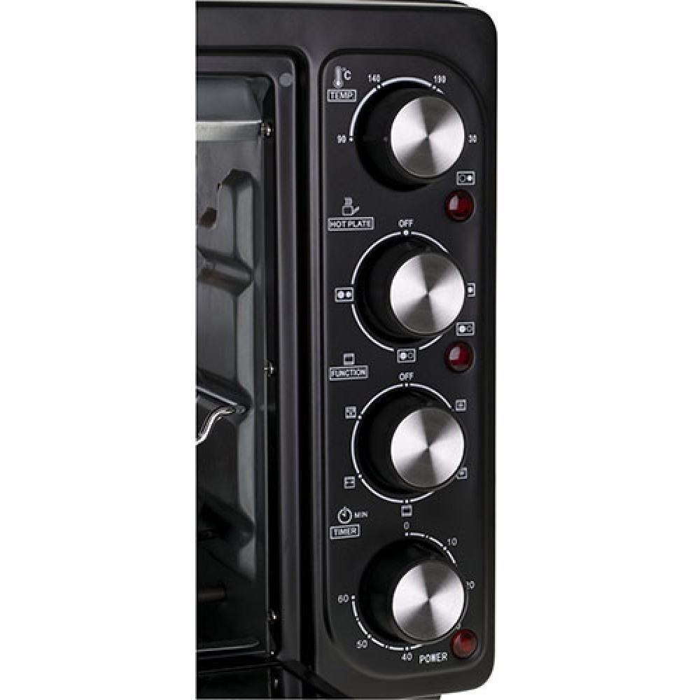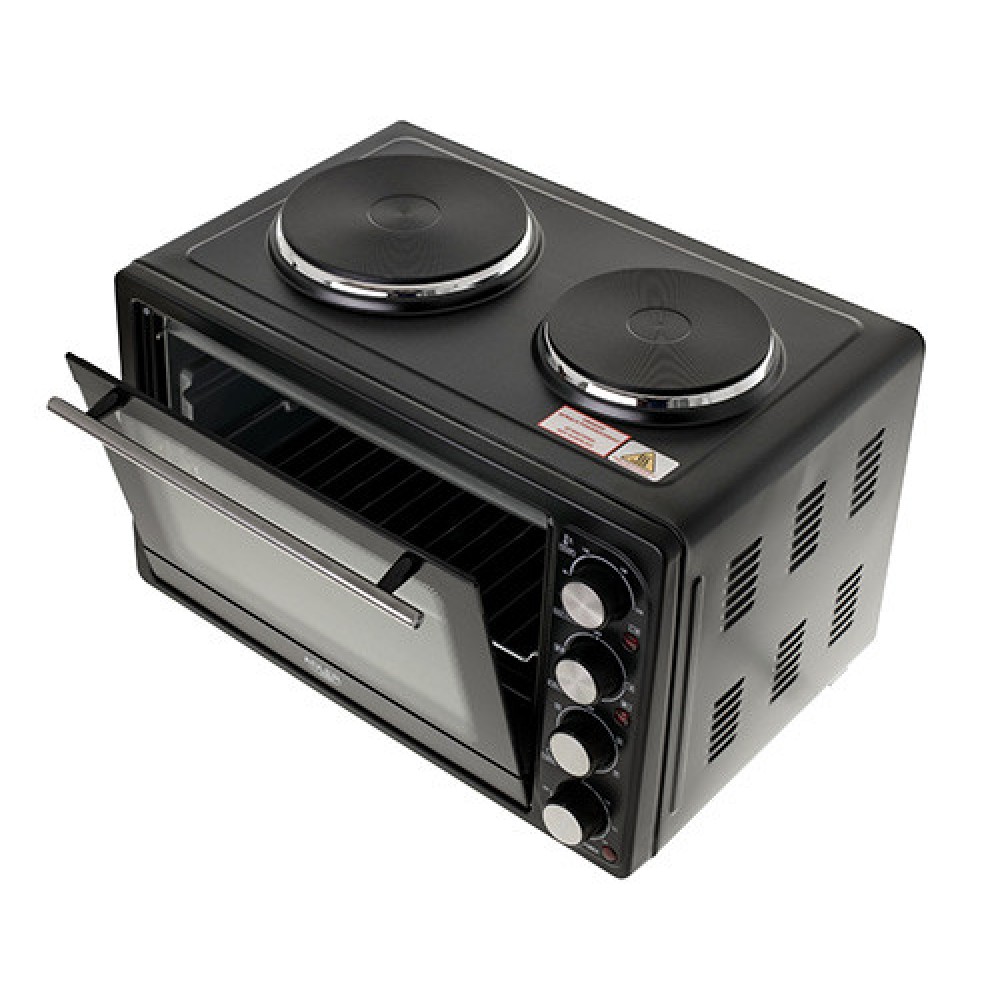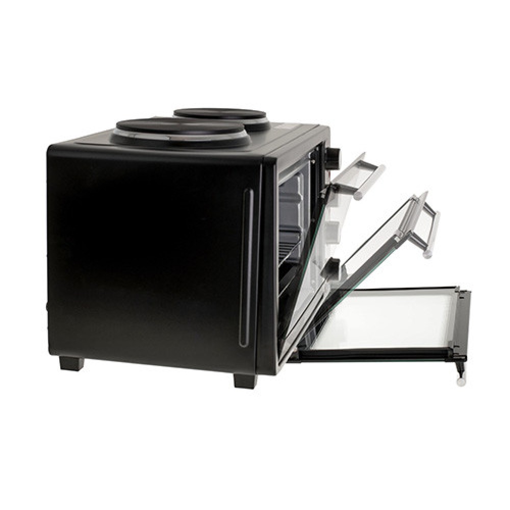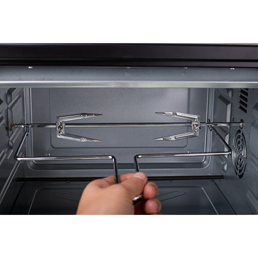 Электрическая духовка с двойной плитой, вертелом, грилем и противнем. Это позволяет готовить запеченное мясо, пирожные, запеканки и другие блюда, требующие высоких температур.