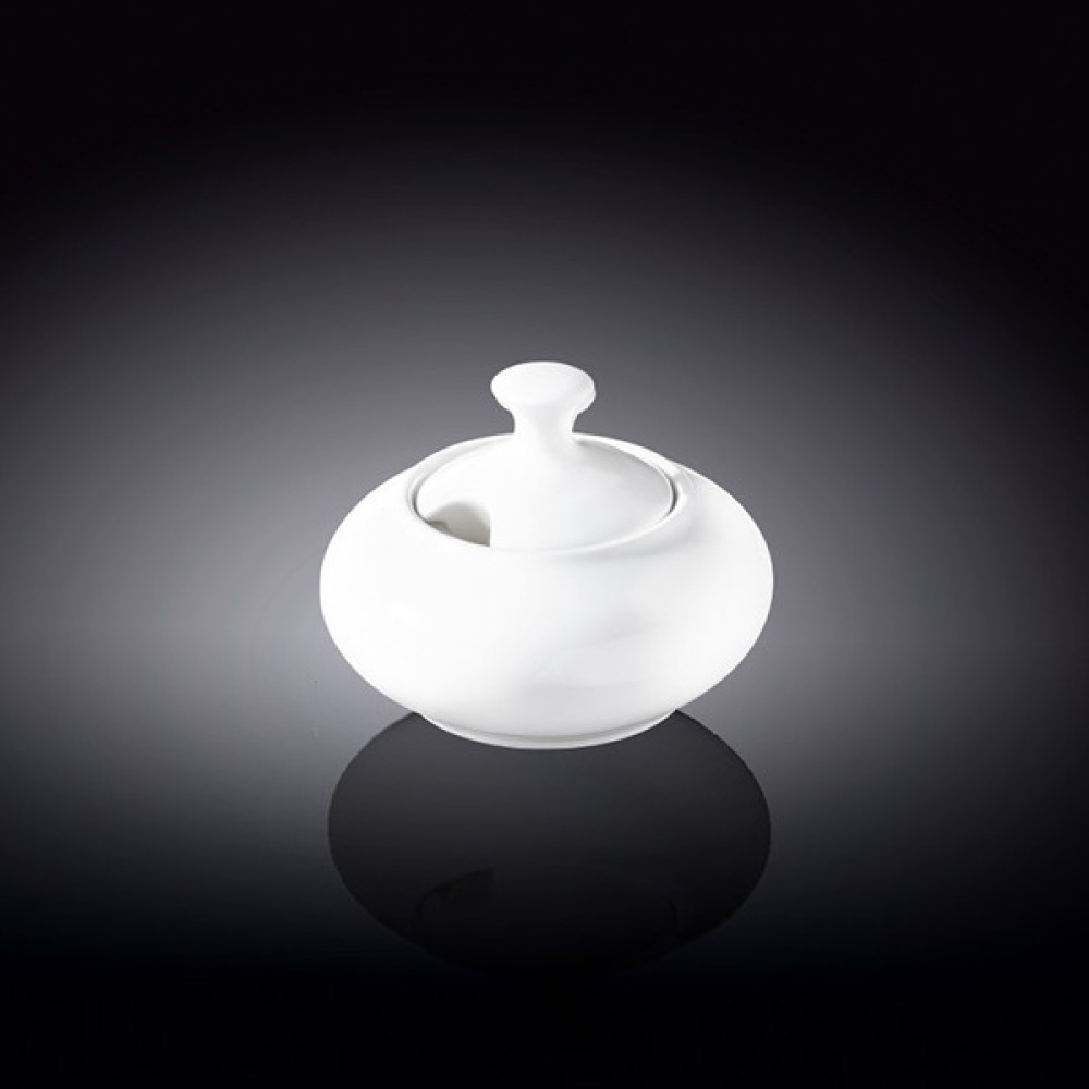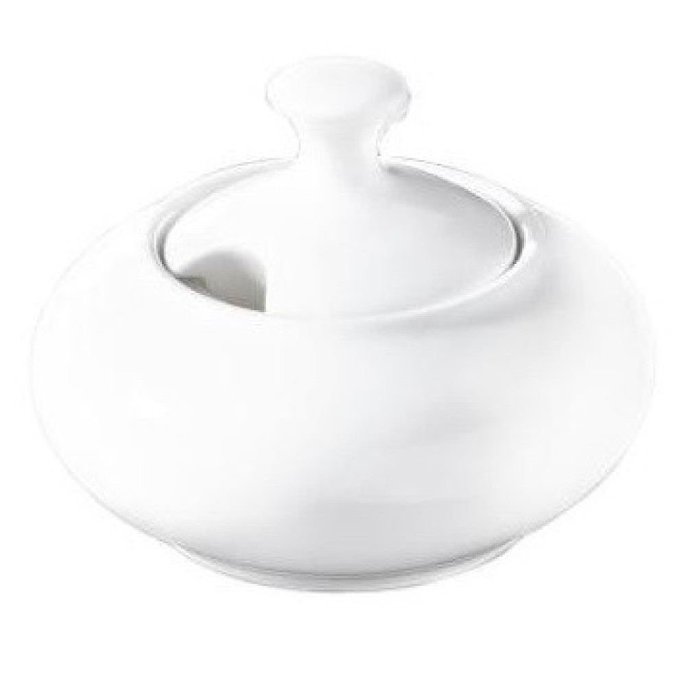 Сахарница белого цвета, изготовленная из высококачественного фарфора. Эта изысканная посуда прекрасно подойдет для сервировки стола и подчеркнет вкус и статус хозяев.