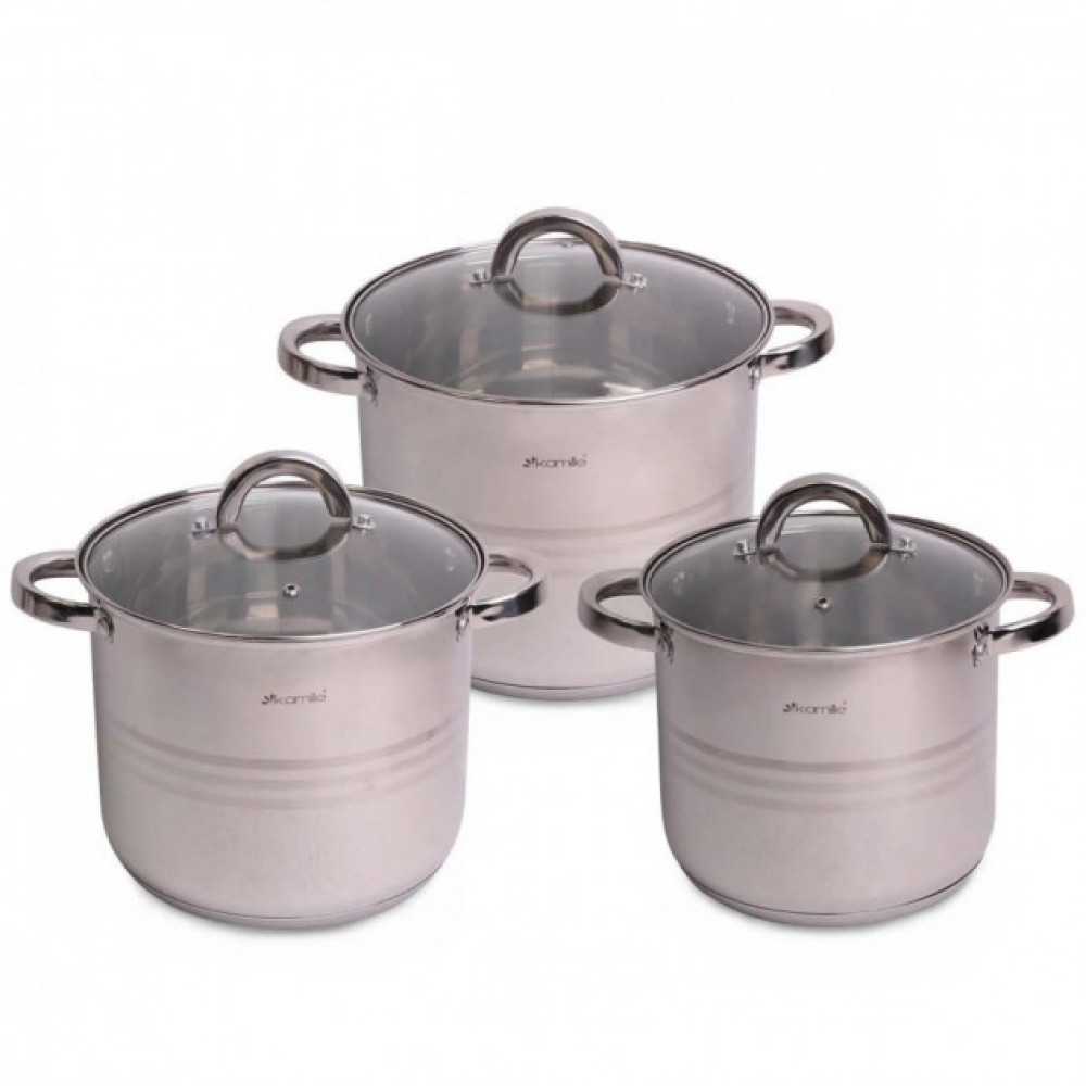 Набор кастрюль Kamille KM-5807 состоит из 6 предметов. Кастрюли изготовлены из качественной нержавеющей стали, а крышки — из термостойкого стекла с металлическим ободком. Многослойное дно обеспечивает равномерное распределение тепла и подходит для всех источников тепла.