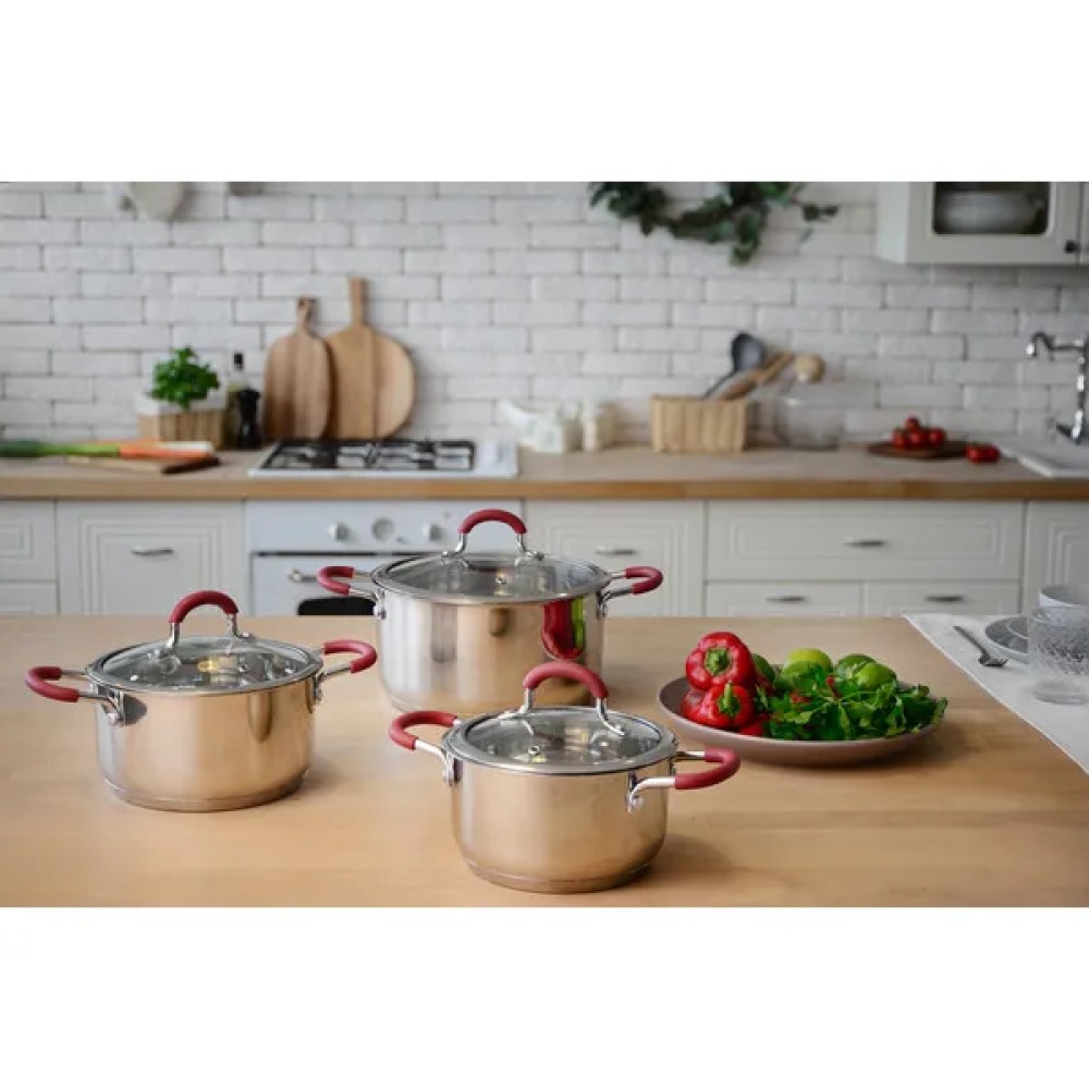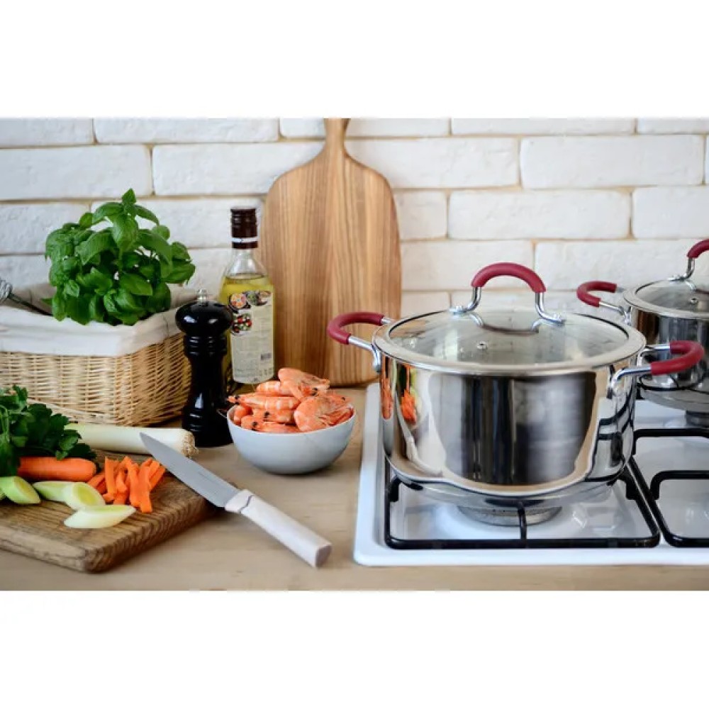 • Материал ручек: нержавеющая сталь с силиконовыми накладками бордового цвета;