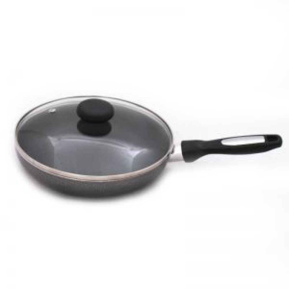 Алюминиевая с антипригарным покрытием и стеклянной крышкой.