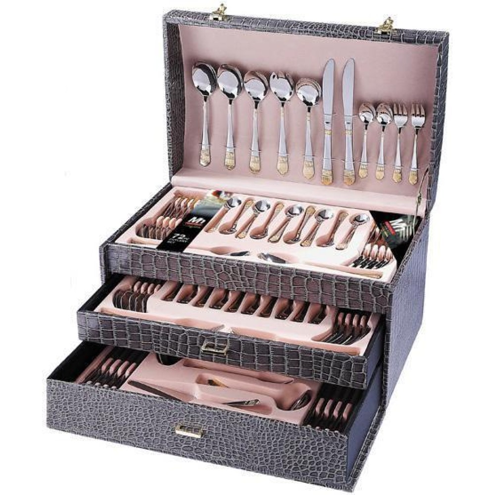 Набор столовых приборов от компании Miller House предназначен для 12 персон. Все предметы упакованы в дипломат (сундук) с 3 ярусами и отделкой под кожу крокодила.