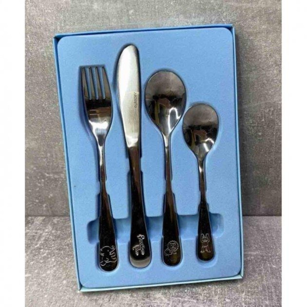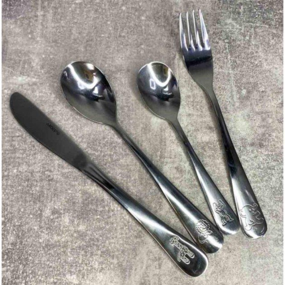 Набор детских столовых принадлежностей на 4 предмета. Включает в себя: ложку, вилку и нож. Принадлежности выполнены из нержавеющей стали с зеркальной полировкой.