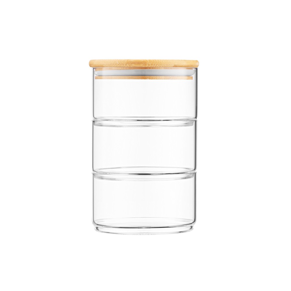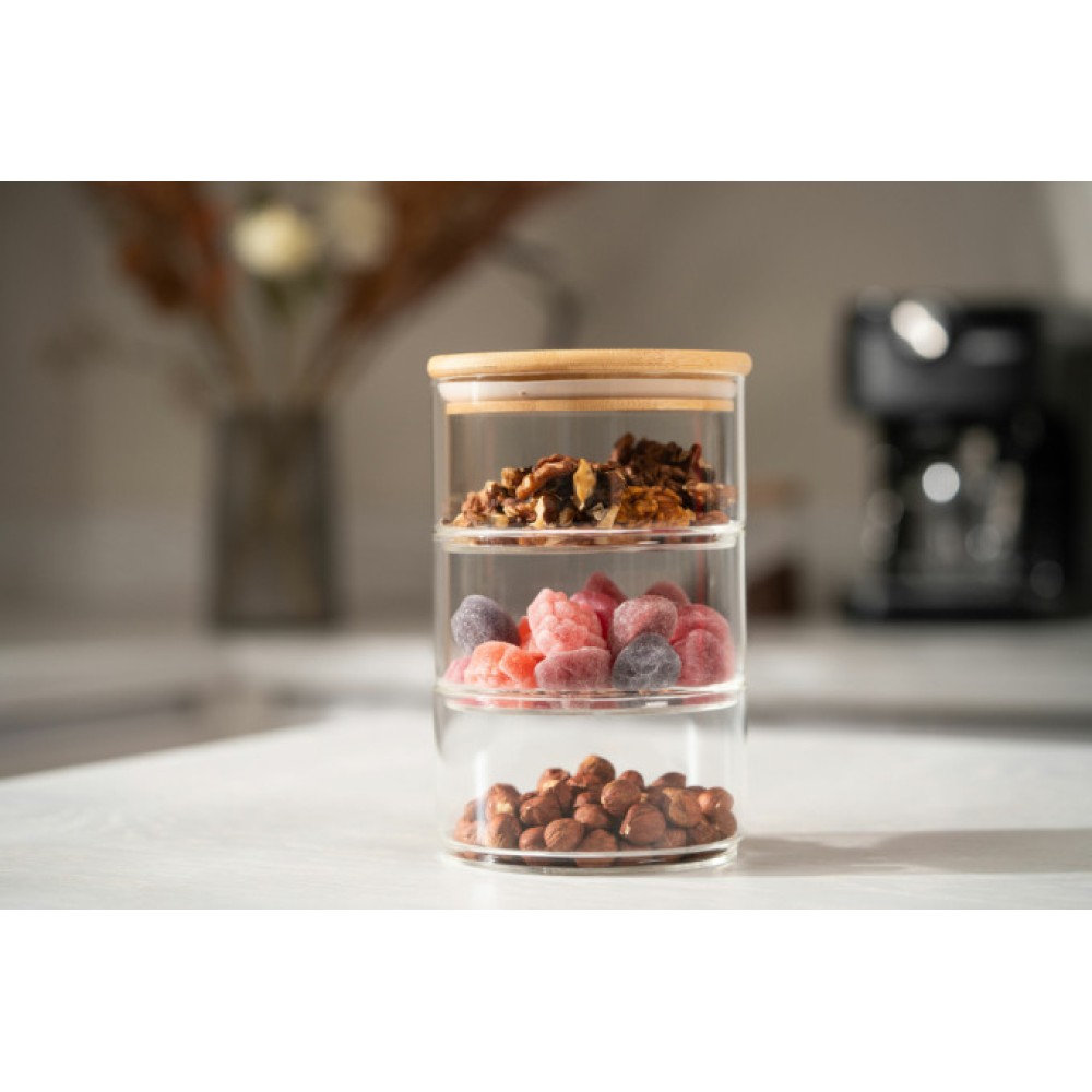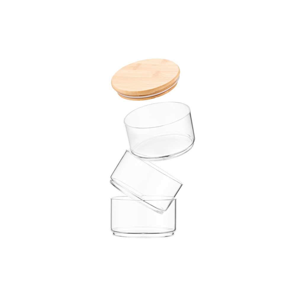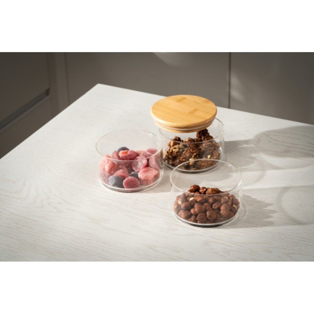 Набор для хранения ARDESTO Midori включает три прозрачные емкости объемом по 400 мл, изготовленные из боросиликатного стекла, и бамбуковую крышку. Емкости позволяют сэкономить пространство, если ставить их друг на друга.